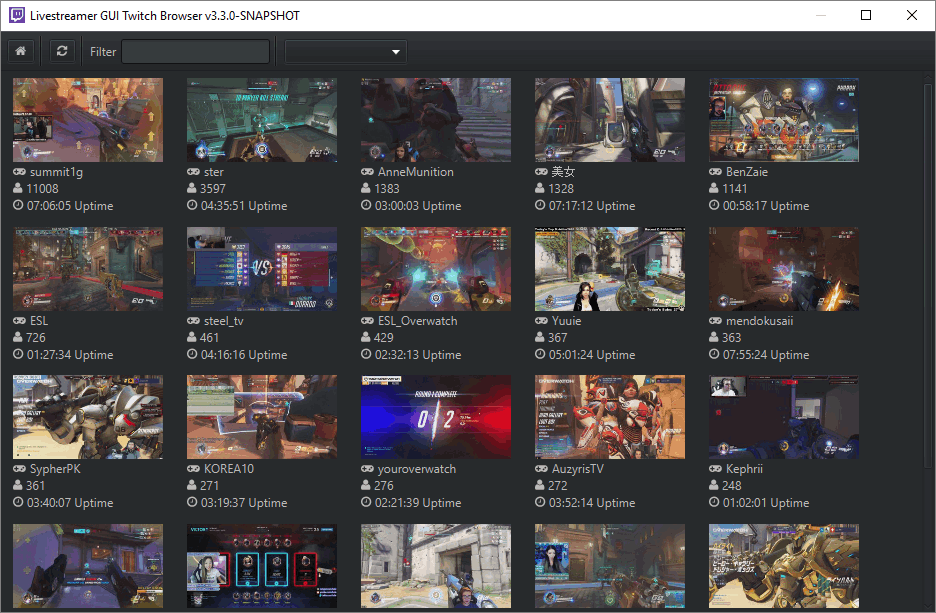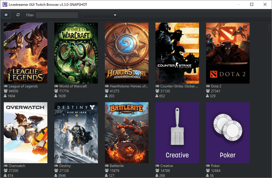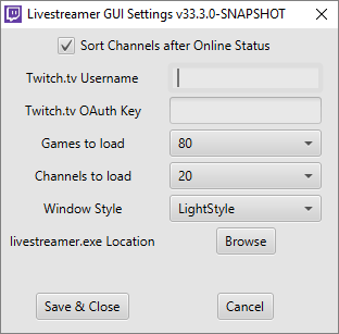 This application is a GUI for the console applications livestreamer and streamlink. These applications allow the viewing or recording of supported streaming services on external video players (like the VLC player). It provides an easier access to these applications API and provides several other functions, mostly focused around the streaming service of Twitch.tv. I created this small application because there were no other GUI application which fit my needs at the time. It also was an opportunity for me to deepen my knowledge of the Java language(Java 7 and 8).