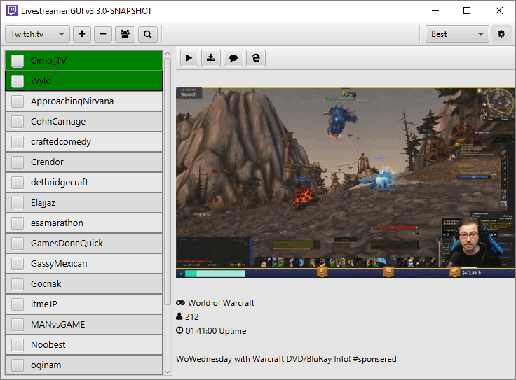 - Several buttons for quick actions: Start playback or record via livestreamer/streamlink, open in-built chat client or open the official chat in a browser window, open the channel in a browser window
